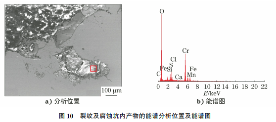 保护套管断口的SEM形貌如图8所示,断口可见沿晶裂纹。金属编织网与波纹管处的SEM形貌如图9所示,可见腐蚀坑及沿晶裂纹。对裂纹及腐蚀坑内的产物进行能谱分析,结果如图10所示,由图10可知:该处有含量较高的腐蚀性硫元素和氯元素,说明试样的使用环境中含有这些元素,这些元素导致金属软管中的金属编织网及波纹管焊接处的根部发生了应力腐蚀。