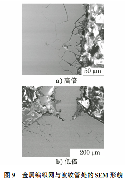 (2)金属软管内的金属编织网及波纹管在腐蚀性介质的作用下发生沿晶应力腐蚀开裂,导致金属编织网断裂和波纹管减薄,软管最终在外力的作用下断裂。