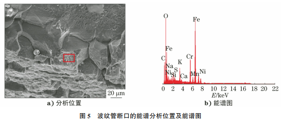 波纹管断口的SEM形貌如图4所示,由图4可知:外侧呈沿晶断裂特征,内侧呈韧窝特征,为瞬断区;波纹管断裂于外侧,断口上可见异物覆盖。对波纹管断口进行能谱分析,可检测到腐蚀性硫元素,结果如图5所示。