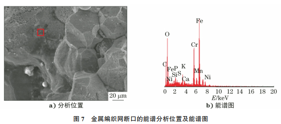 金属编织网断口的SEM形貌如图6所示,由图6可知:金属编织网断口呈沿晶断裂特征,表面可见沿晶状龟裂,断口上可见异物覆盖。对金属编织网断口进行能谱分析,可检测到腐蚀性硫元素,结果如图7所示。