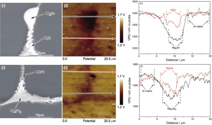 晶界相与铝基体间ΔVPD,是影响阳极溶解的重要因素。ΔVPD绝对值越大越有利于阳极晶界相溶解,即Ga、In、Sn更容易从晶界相中析出。时效态合金晶界相与铝基体间ΔVPD的绝对值大,因此时效态合金晶界相中的Ga、In、Sn更容易析出。