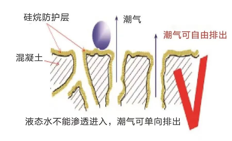 硅烷涂层主要用于混凝土防腐,不具备修饰作用,因为它涂在混凝土表面是透明的,不会改变混凝土的颜色外观。浸渍在混凝土表面和一定深度的硅烷为小分子聚合物,不会堵住混凝土的毛细孔,使混凝土保持透气性能;同时硅烷在混凝土内部反应后形成憎水层,能够防止外部水分进入混凝土,从而有效防止渗水、酸雨、海水等对混凝土和内部钢筋结构的腐蚀,提高混凝土结构的使用寿命。硅烷浸渍适用于钢筋混凝土等结构,如海港、工厂等。