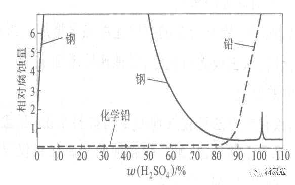 当硫酸质量分数低于70%时,应采用铅制的设备,铅表面可以生成PbSO4的保护膜。在硫酸环境中,钢和铅具有互补性。