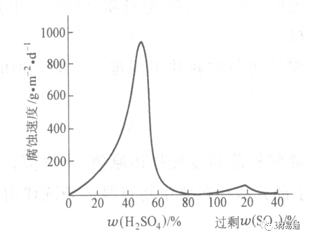 硫酸质量分数低于50%时,碳钢的腐蚀速度随浓度增加腐蚀速度急剧增加;