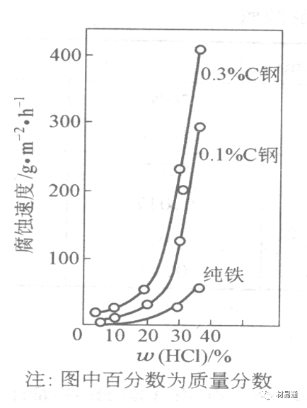 工业纯铁与碳钢的腐蚀速度随盐酸的浓度成指数关系增加,钢不能用于盐酸介质中。