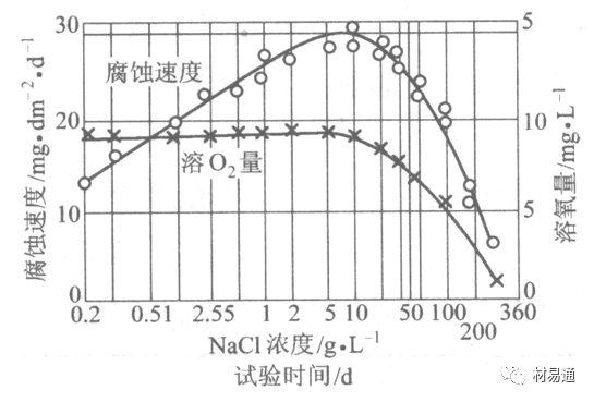 以NaCl为主,海水中盐的浓度与钢的腐蚀速度最大的盐浓度范围相近,当溶盐浓度超过一定值,因氧溶解度降低,金属腐蚀速度下降,见图8。