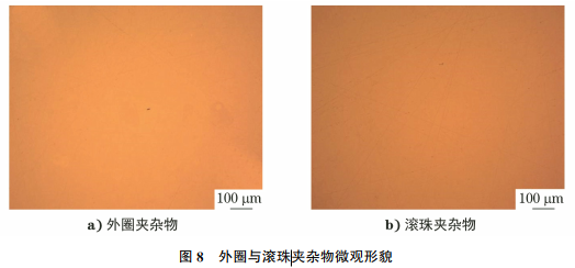 制取外圈、滚珠截面的金相试样,依据GB/T10561—2005《钢中非金属夹杂物含量的测定标准评级图显微检验法》进行非金属夹杂物含量的测定,结果均满足技术要求,夹杂物等级为0.5级。外圈与滚珠剥落区附近未见异常的夹杂物堆积,外圈与滚珠夹杂物微观形貌如图8所示。