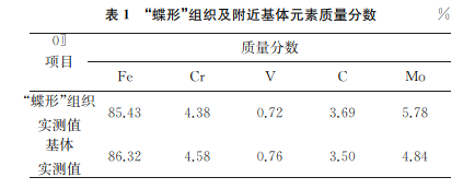 对白色“蝶形”组织与附近基体组织进行能谱分析,面扫描结果如图5所示。“蝶形”组织及附近基体元素质量分数如表1所示,由表1可知:“蝶形”组织元素组成与基体无明显差异,表明“蝶形”组织在形成过程中不存在元素的偏聚,基体之间无明显的元素迁移现象。