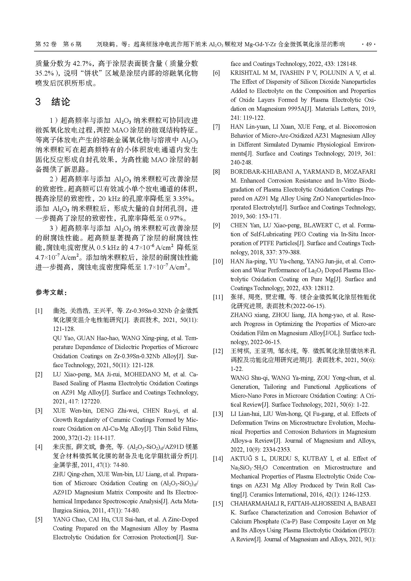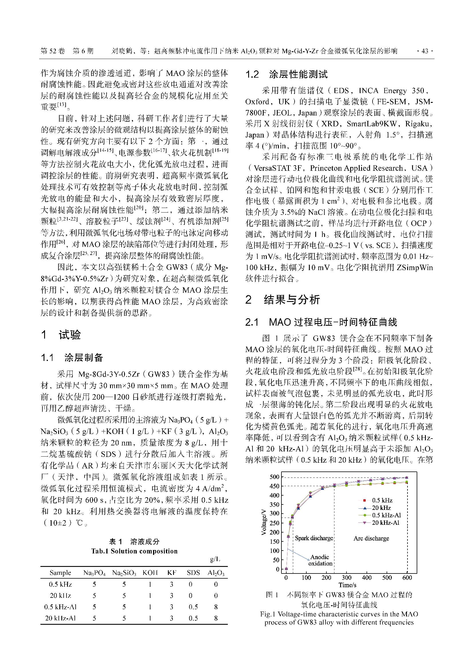 超高频脉冲电流作用下纳米Al2O3 颗粒对Mg-Gd-Y-Zr 合金微弧氧化涂层的影响