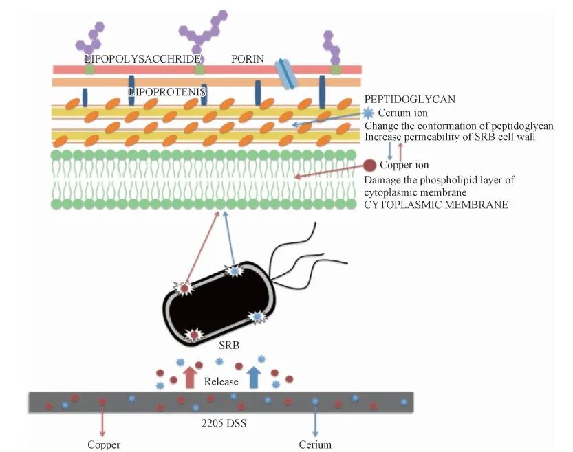 此外,SRB自身代谢过程中会消耗掉一部分具有抗菌作用的Cu离子,通过在2205-Cu双相不锈钢中添加一定量的Ce元素,对生物膜内固着态SRB的抑制效果大幅度提高,相比于单一添加Cu元素的含Cu抗菌不锈钢来说,使最大或然数计数(MPN)数值由对照组的107下降为104,表面由FeS和FeS2构成的腐蚀产物层消失,形成由Cr2O3和Cr(OH)3构成的致密钝化膜,表面点蚀坑深度大幅度减小,这是Cu离子和Ce离子协同作用的结果。图8所示为2205-Cu-Ce双相不锈钢对SRB作用的机理示意图。