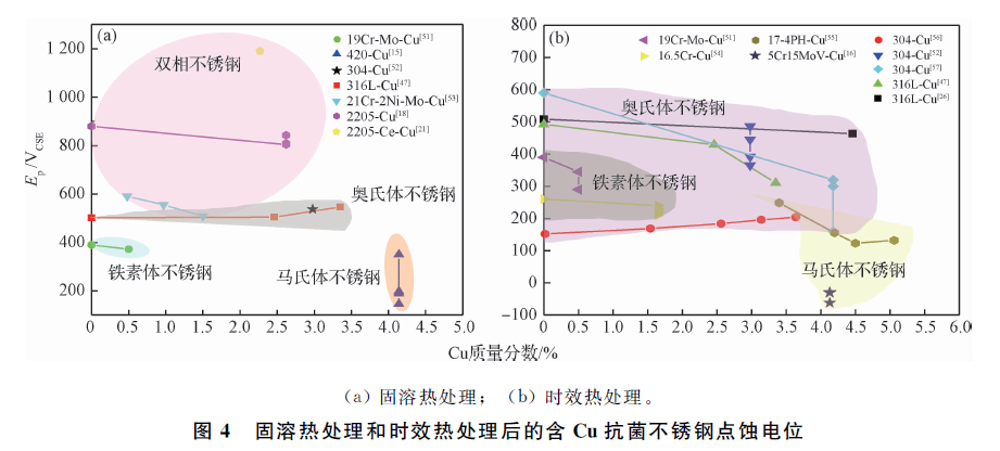 传统不锈钢会通过固溶或退火处理,消除冷热加工所产生的内应力,使合金发生再结晶,以保证材料在使用过程中具备良好的力学性能和耐蚀性能。有研究者在对固溶或退火处理的含Cu抗菌不锈钢的点蚀性能研究时发现,Cu的添加可以稍微提高316L-Cu不锈钢的耐点蚀性能;而对双相不锈钢和铁素体不锈钢来说,Cu的添加会降低其耐点蚀性能;但是随着固溶温度的提高,含Cu抗菌不锈钢的耐点蚀性能可逐渐得到恢复。
