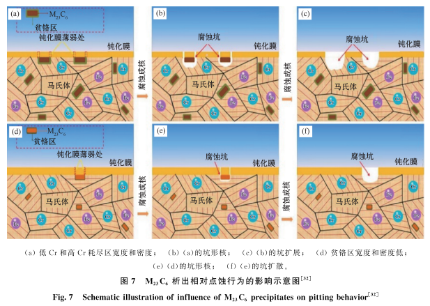 含氮马氏体不锈钢的腐蚀行为研究进展 安浩然,王睿,康燕,于志强,赵宇宏,闫志杰 (中北大学材料科学与工程学院, 特殊环境先进金属材料山西省重点实验室, 山西 太原 030051) 摘 要:含氮马氏体不锈钢(nitrogen-alloyed martensitic stainless steel, NAMSS)因其高韧性、高硬度、优良的抗疲劳性能和良好的耐腐蚀性而被广泛应用。耐腐蚀性能对NAMSS的使用寿命起着至关重要的作用,因此,研究NAMSS的腐蚀行为具有重要的学术意义和工程应用价值。结合国内外的研究工作,对NAMSS的腐蚀行为的研究工作进行了综述和分析。与传统马氏体不锈钢相比,NAMSS中析出相减少,提高了NAMSS的耐蚀性。NAMSS中夹杂物残留导致腐蚀成核位置增加,加速了腐蚀速率。N的存在促进了NAMSS中残余奥氏体/逆变奥氏体的形成,有利于耐蚀性能的改善。但是,过多的N含量反而不利于钢的耐腐蚀性能。最后,对未来NAMSS腐蚀行为的研究工作做了展望。 关键词:含氮马氏体;不锈钢;腐蚀行为;逆变奥氏体;析出相 引用格式: 安浩然,王睿,康燕,于志强,赵宇宏,闫志杰. 含氮马氏体不锈钢的腐蚀行为研究进展[J]. 钢铁研究学报,2023,35(06):635-650. DOI:10.13228/j.boyuan.issn1001-0963.20220284 重要图表: 结语与展望: 随着马氏体不锈钢设计寿命要求越来越高以及服役环境的复杂性,改善其耐腐蚀能越来越重要。用N部分替代C可以显著改善马氏体不锈钢的耐腐蚀性能,本文就国内外含氮马氏体不锈钢的腐蚀行为的研究工作做了综述和分析,总结如下: (1)用N替代C后,随着马氏体不锈钢钢中N含量的逐步增加,钢中总析出相的数量先减少后增加,贫铬区的面积也会先缩小后扩大,相应的,马氏体不锈钢的耐IGC抗性,抗点蚀和应力腐蚀的性能都会呈现出先增强后弱化的趋势。 (2)N的存在有利于逆变奥氏体形核,形核过程中会消耗C元素,一定程度上减少了马氏体钢中析出相的数量,微弱地增强了钢的抗腐蚀性。 (3)含氮马氏体不锈钢中的夹杂物会促进腐蚀行为的发生。氧化物夹杂物会比MnS型夹杂物有更好的再钝化能力,可以抑制点蚀的扩展。 综上所述,含氮马氏体不锈钢中析出相对腐蚀的影响要远远大于其他因素,所以在改善含氮马氏体不锈钢耐腐蚀性能时要重点考虑析出相的种类、大小、形貌、数量和分布。一般常用少量N替代钢中的C来达到改善马氏体不锈钢耐腐蚀性能的目的。目前,对含氮马氏体不锈钢的腐蚀行为研究有限,为了揭示含氮马氏体不锈钢的腐蚀机制,在未来的研究工作中,需要进一步开展如下研究: (1)进一步系统地研究含氮马氏体不锈钢的应力腐蚀,通过制定较为全面的腐蚀实验,建立预测腐蚀疲劳裂纹扩展的模型。 (2)关于N可以显著改进不锈钢的腐蚀性能的相关机制仍有争议,例如N促进NH3/NH4+的形成可以提高局部溶液pH,促进钝化膜中Mo与Cr的富集是改善不锈钢点蚀广为接受的理论,本质是N的溶解影响了其他元素溶解和沉淀的过程,但局部pH的改善如何影响其他元素的溶解和沉淀及影响程度仍缺乏相关理论支持。 (3)含氮马氏体不锈钢在服役环境失效机制方面的研究薄弱,缺乏实际服役环境下相关数据的积累。因此,需要建立模拟研究含氮马氏体不锈钢在服役环境腐蚀失效方法,阐明失效机制,同时加强相关数据的积累,为进一步优化合金成分设计提供理论依据。