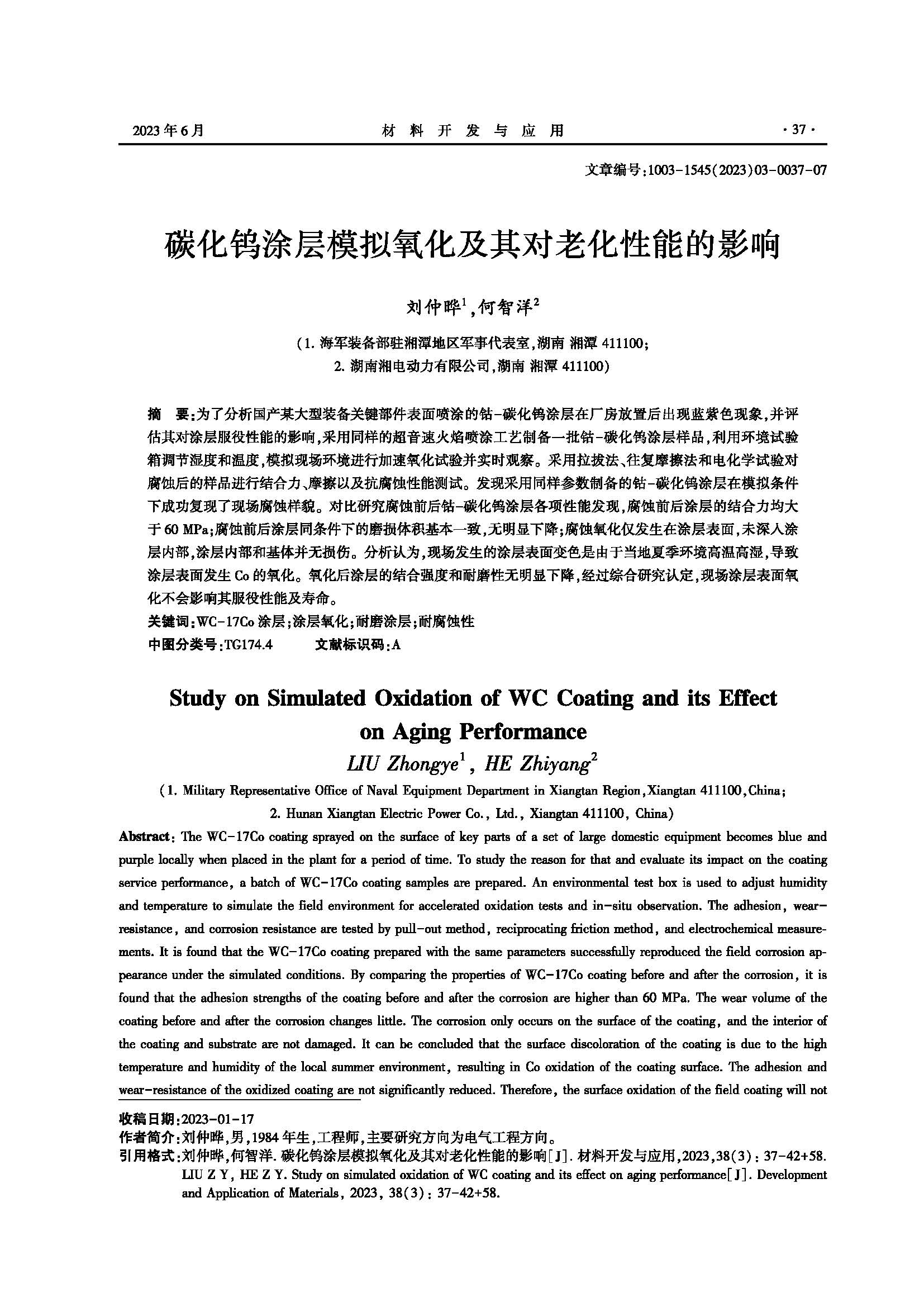 碳化钨涂层模拟氧化及其对老化性能的影响