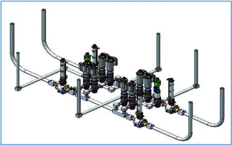 流花某气田中心管汇的主工艺管线、管件使用材料为S31803双相不锈钢,管线三维图如图2所示,该中心管汇经过了防腐蚀涂装。