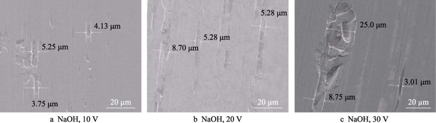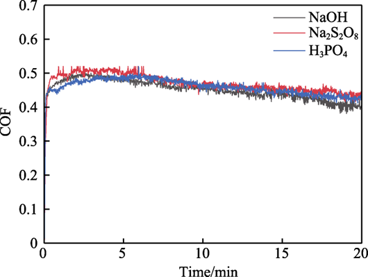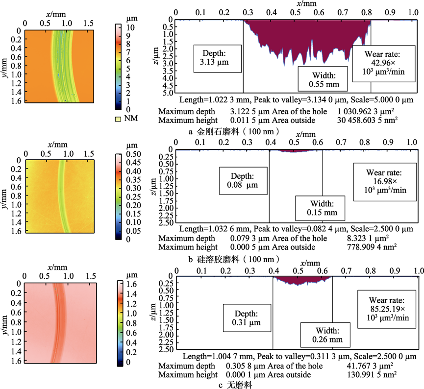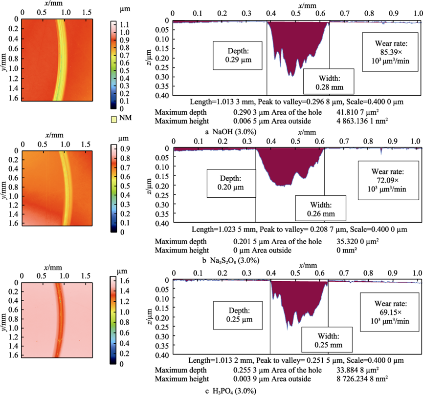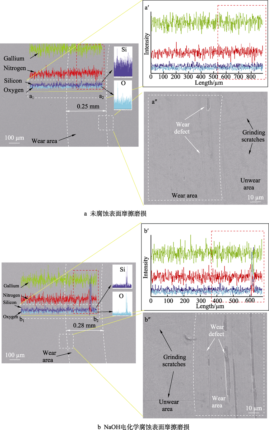 关键词:GaN晶片;电化学;腐蚀;摩擦磨损;摩擦因数;微观形貌 不同介质环境下GaN晶片摩擦因数曲线 不同电解质溶液电化学腐蚀GaN晶片的摩擦因数曲线 不同电解质溶液电化学腐蚀摩擦磨损沟槽截面图 不同电位下电化学腐蚀GaN晶面摩擦因数曲线 不同磨料对腐蚀面摩擦磨损沟槽截面图 不同电解质溶液的极化曲线 不同GaN晶片表面摩擦磨损区域形貌分析 不同腐蚀电位的电化学腐蚀磨损痕SEM形貌 通过GaN晶片的摩擦磨损实验,研究了不同介质环境下GaN晶片表面磨损的摩擦因数及磨痕形貌,进一步研究了电化学作用下不同电解质溶液电化学腐蚀、不同腐蚀电位电化学腐蚀GaN晶片表面的摩擦磨损特性,最后探讨了磨料的引入对GaN晶片表面摩擦磨损特性的影响,得出以下结论。 1)在摩擦磨损过程中,介质环境对表面摩擦的影响较大。在干摩擦环境时摩擦因数约为0.6,且摩擦因数曲线波动较大。在去离子水介质环境下,摩擦因数约为0.2,摩擦因数曲线相对平稳,说明在摩擦过程中水介质起到了润滑作用。 2)GaN晶片经电化学腐蚀后,其摩擦因数比未腐蚀晶片的摩擦因数大。不同电解质电化学腐蚀GaN晶片的摩擦因数曲线相互交叉,NaOH溶液电化学腐蚀表面磨痕沟槽的深度、宽度、磨损率最大,其次为Na2S2O8电化学腐蚀表面,最后为H3PO4电化学腐蚀表面。在GaN晶片表面磨痕区域,材料破损缺陷存在明显差异,NaOH溶液电化学腐蚀表面的材料脆性破损缺陷区域最大,Na2S2O8溶液和H3PO4溶液电化学腐蚀表面材料脆性破损缺陷区域较小。由电化学腐蚀极化曲线塔菲尔外推法得到的腐蚀速率实验结果表明,在电化学过程中GaN晶片的腐蚀速率依次为NaOH>Na2S2O8>H3PO4。NaOH溶液电化学腐蚀面的磨损程度最大,说明电化学腐蚀作用有效提高了表面摩擦磨损率。 3)随着电化学腐蚀电位的增大,GaN晶片腐蚀表面摩擦因数呈逐渐增大趋势,摩擦表面磨痕沟槽尺寸、磨损率逐渐变大。通过观察摩擦痕表面微观结构发现,腐蚀电位越高,磨痕区域内材料破损缺陷越多,材料脆性断裂去除的形式越强。说明腐蚀电位越高,表面电化学腐蚀作用越强,在摩擦过程中磨痕表面材料脆性断裂形式越明显。 4)磨料对电化学腐蚀表面摩擦实验的影响差异较大。硬质金刚石磨料能极大地增加磨损区域磨痕尺寸和磨损率,在磨损区域材料破损缺陷增多,磨损缺陷材料去除主要为脆性断裂形式。在软质球形硅溶胶磨料的表面磨痕区域未见明显破损缺陷,在其表面可见塑性域去除痕,软质硅溶胶磨料能有效减少电化学腐蚀表面摩擦磨损材料的去除缺陷。