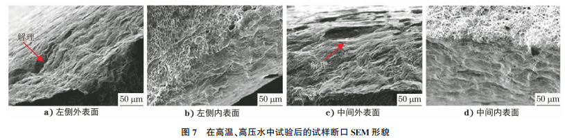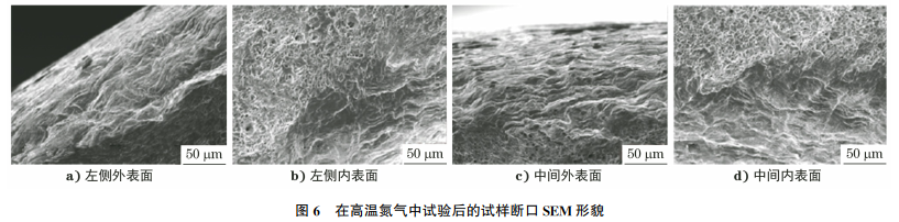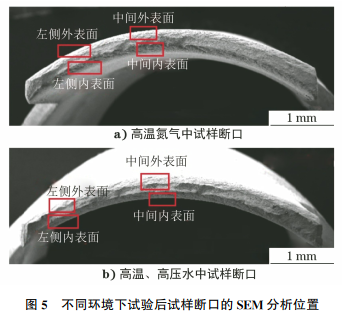 对试验后的试样进行SEM分析,分析位置如图5所示,在两种试样上选取的典型位置分别为:左侧外表面 、左侧内表面、中间外表面、中间内表面。在高温氮气中试验后的试样断口SEM形貌如图6所示,在高温、高压水中试验后的试样断口SEM形貌如图7所示。