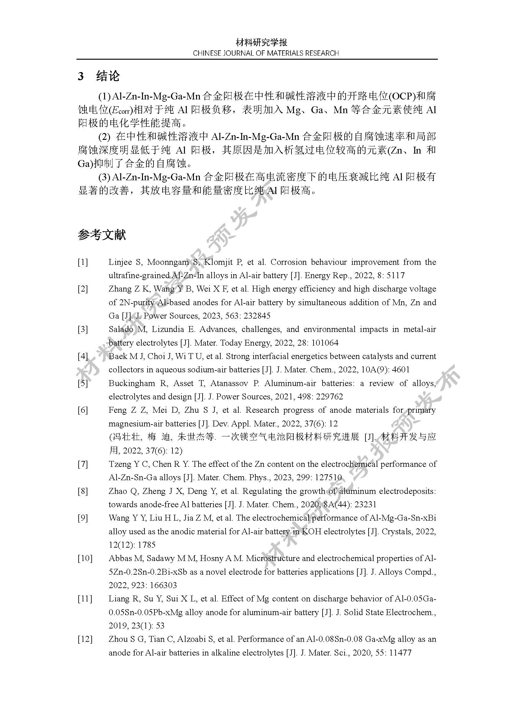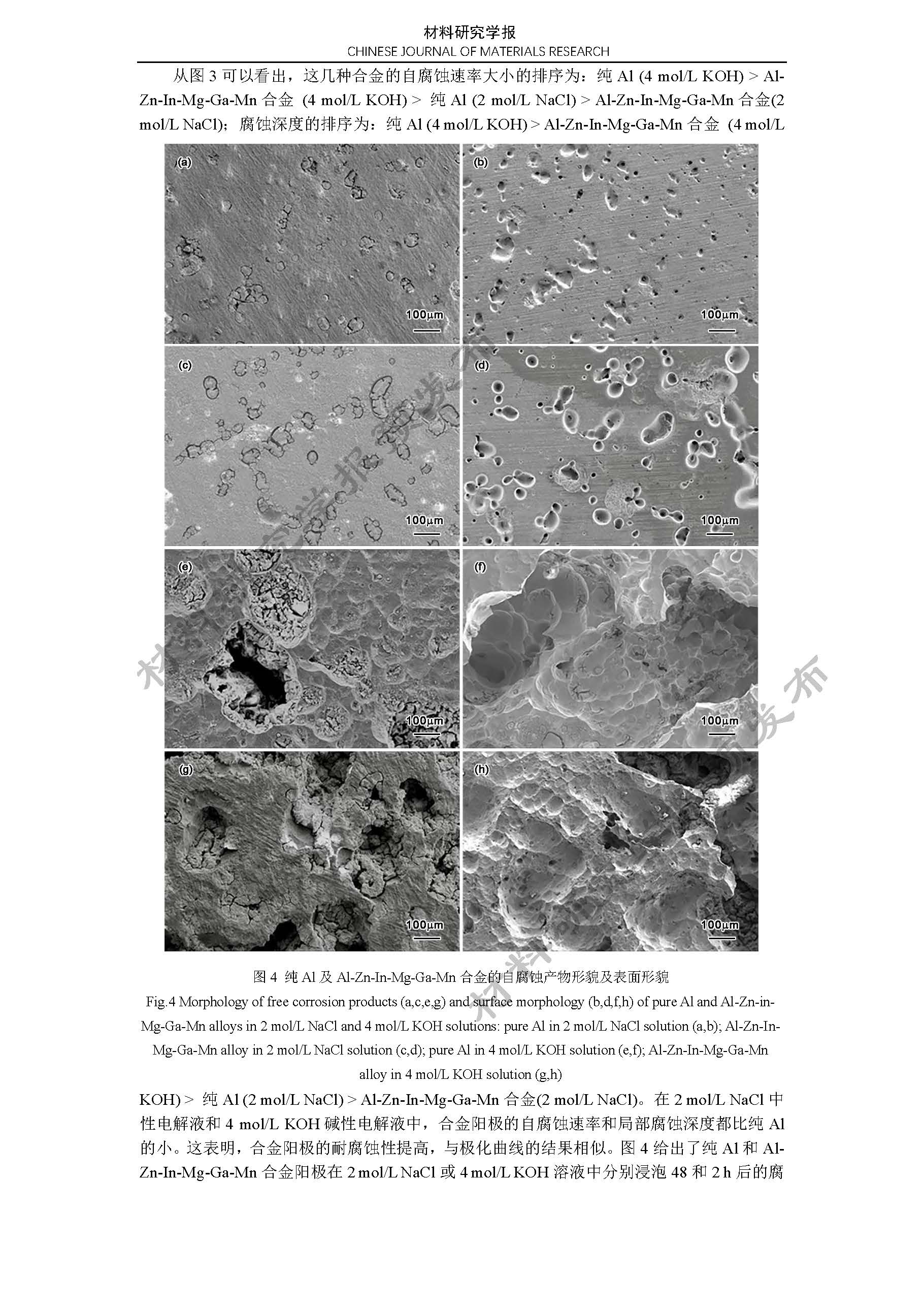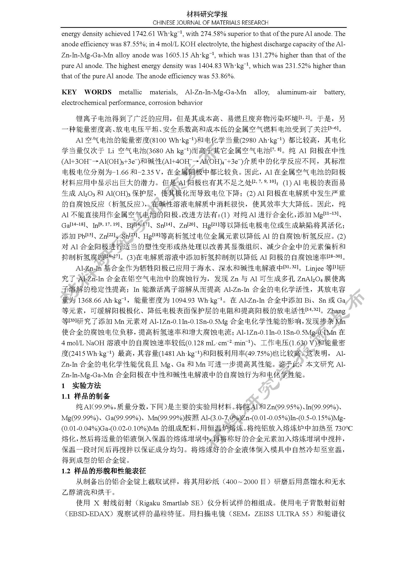 铝空气电池 Al-Zn-In-Mg-Ga-Mn 合金阳极的电化学性能