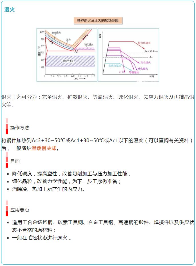 16图详解各种热处理工艺 1.热处理的各阶段及要素 2.热处理工艺分类 3.钢铁热处理工艺:钢铁是机械工业中应用最广的材料,钢铁显微组织复杂,可以通过热处理予以控制,所以钢铁的热处理是金属热处理的主要内容。另外,铝、铜、镁、钛等及其合金也都可以通过热处理改变其力学、物理和化学性能,以获得不同的使用性能。 4.固溶处理 5.深冷处理 6.表面热处理 7.化学热处理:化学热处理是通过改变工件表层化学成分、组织和性能的金属热处理工艺。化学热处理是将工件放在含碳、氮或其它合金元素的介质(气体、液体、固体)中加热,保温较长时间,从而使工件表层渗入碳、氮、硼和铬等元素。
