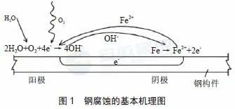 输油管道是保障石油和天然气正常运输的主要通道,由于钢质管道的腐蚀,易引起消费企业停工停产,影响居民生活供气、供采暖等。埋地输油管道的泄漏,除损失大量有用物质外又会形成严重的环境污染,以至引起火灾、爆炸等灾难性事故。鉴于金属腐蚀的普遍存在,为了避免或减缓金属腐蚀的发生,各种金属防腐蚀技术和工艺应运而生。为应对输油管道腐蚀的危害性,油田引进推广金属防腐蚀新工艺、新资料、新设备,加药改变水质和改变输油工艺,从而延长管道设备运用寿命,节省资金,保证安全生产。由于腐蚀的复杂性和多变性,任何防腐蚀技术都不是万能的,腐蚀是绝对的,防腐是相对的,所以我们需要更全面深入地了解腐蚀的环境特点,并通过合理的选材和设计预防腐蚀,同时采取适宜的技术与措施来控制腐蚀,这样才能将石油管道的腐蚀损失降到最低程度。 腐蚀是金属和周围的环境因化学或电化学反应而导致的破坏性侵蚀。狭义的腐蚀指金属的腐蚀;腐蚀广义上是指化学或电化学材料和环境之间的相互作用,导致材料功能破坏。钢腐蚀的基本机理如图1所示,它的本质是金属元素形成化合物的氧化过程。