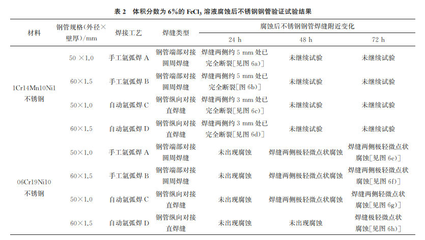 用体积分数为6%的FeCl3溶液对1Cr14Mn10Ni1不锈钢和06Cr19Ni10不锈钢焊接钢管进行腐蚀,焊缝附近局部贫Cr程度不同,导致其耐腐蚀程度差异明显,因此也可以用该方法直观、快速地鉴别焊缝附近局部贫Cr的程度。