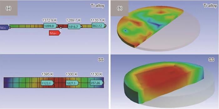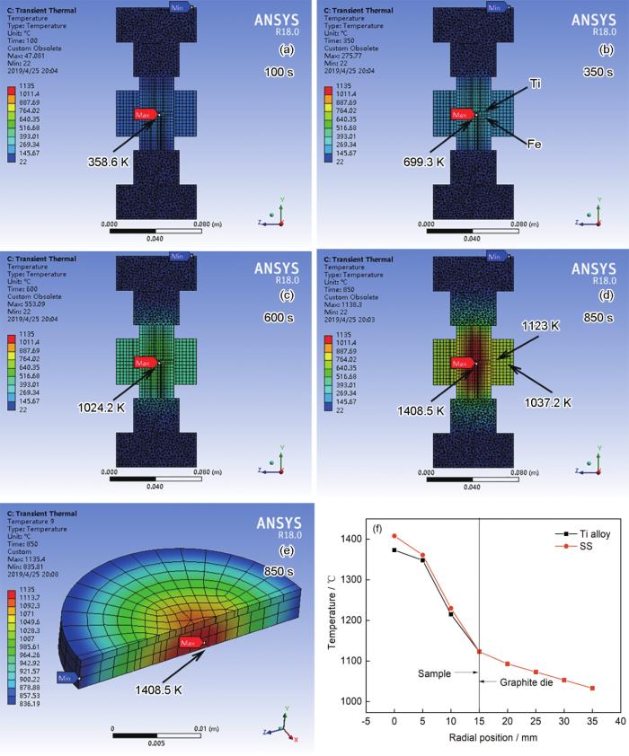 图3给出了放电等离子烧结过程中的温度分布云图。可以看出,整个系统的中心部位和模具外边缘出现较大的温度差,试样附近的温度最高;最高温度出现在不锈钢试样的中心,因为不锈钢的比热容和导热系数比钛合金更小。图3f给出了监测点温度达到1123 K时试样和模具径向的温度分布。可以看出,模具与试样的温度存在较大梯度。监测点的温度为1123 K时试样中心的最高温度可达1408.5 K,而此时模具外表面的最低温度只有1037.2 K,径向温差最大达到371.3 K。
