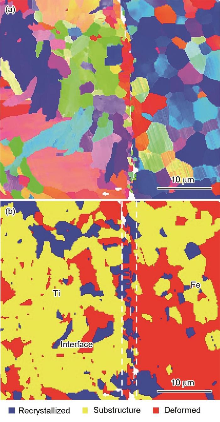 图7给出了钛合金/不锈钢连接界面处的EBSD测试结果。由图7可见,铁合金侧的组织以细小等轴晶粒为主,钛合金侧以典型的针状β相为主。瞬时高能脉冲电流优先积聚于微观凸起表面,使界面间隙处产生微电弧放电,进而在界面放电区域瞬时发生熔化再结晶。因此,界面处以远小于基体组织的细小再结晶晶粒为主[23]。这种界面处的精细组织,是异质复合板材连接质量的保证。