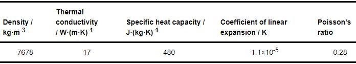 图4a给出了实验过程中温度最高时试样内部的温度分布。可以看出,二者的温度分布类似,均由中心向外圈逐渐递减。不锈钢的温度略高于钛合金,因为不锈钢的导热系数和比热容较小。表3和表4列出了443铁素体不锈钢和TC1钛合金的热物理参数。图4b给出了冷却后钛合金和不锈钢试样内部的残余应力分布。可以看出,不锈钢试样中心的残余应力较大且为拉应力,而钛合金试样则是外围存在较大残余拉应力。其原因是,不锈钢的线膨胀系数大于钛合金,且不锈钢中的温度高于钛合金,使不锈钢受热膨胀时产生较大的形变,但是这种膨胀趋势受到周围模具和钛合金试样的阻碍,使不锈钢试样中心产生可达1122.1 MPa的压应力。较高的温度使不锈钢试样中心产生的压缩变形(1122.1 MPa)超过了不锈钢的屈服极限(σb=483 MPa),于是产生了压缩塑性变形。因此,当温度冷却至室温时,若不锈钢试样中心处自由收缩则体积必然减小,而外圈不锈钢阻碍试样中心的自由收缩,使不锈钢试样的中心受拉而产生较大的残余拉应力。钛合金因反作用力产生与不锈钢相反类型的应力,于是钛合金/不锈钢复合试样中形成了一个平衡的残余内应力体系并长期存在。