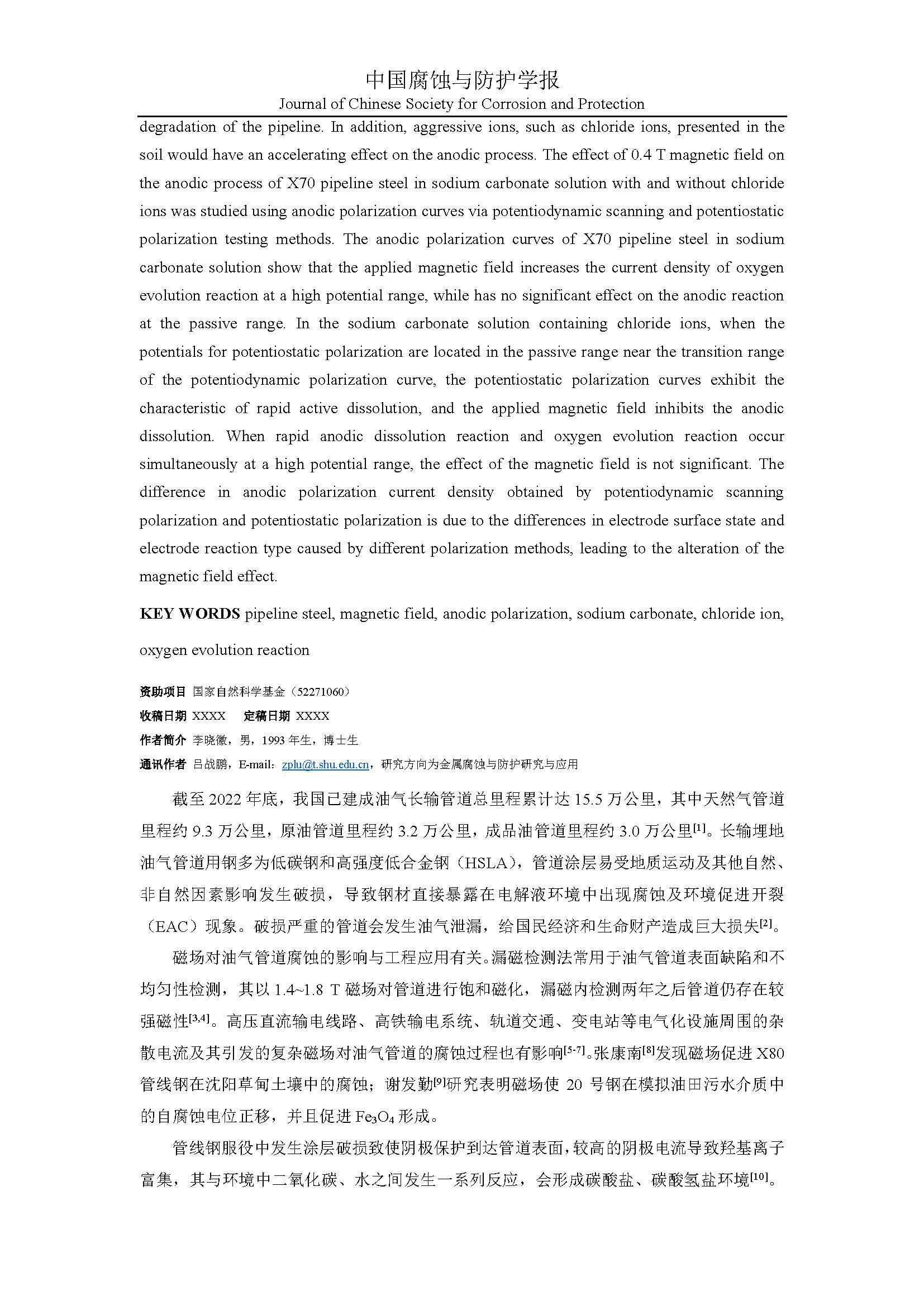 磁场对 X70 管线钢在碳酸钠溶液中阳极过程的影响