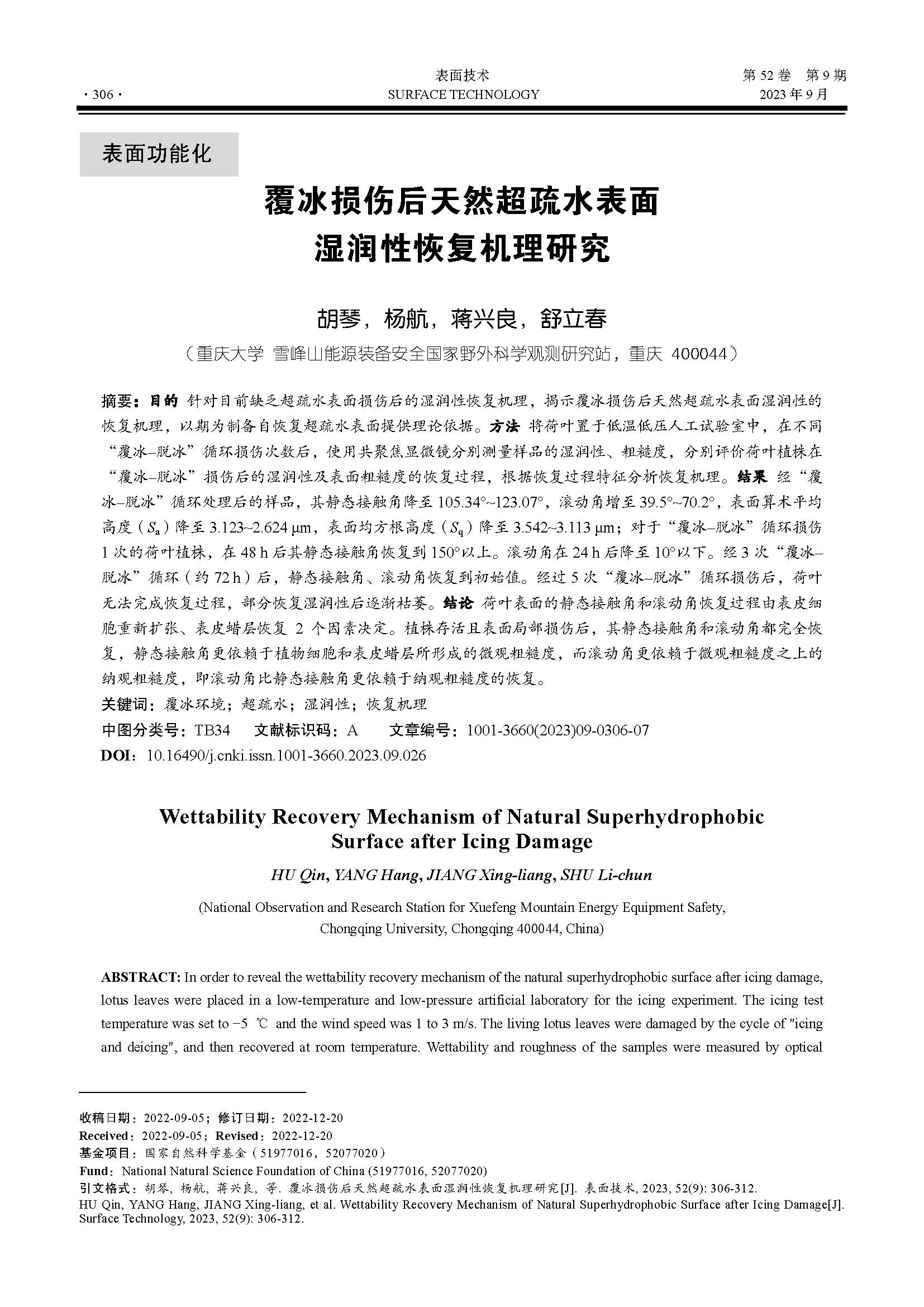 覆冰损伤后天然超疏水表面湿润性恢复机理研究