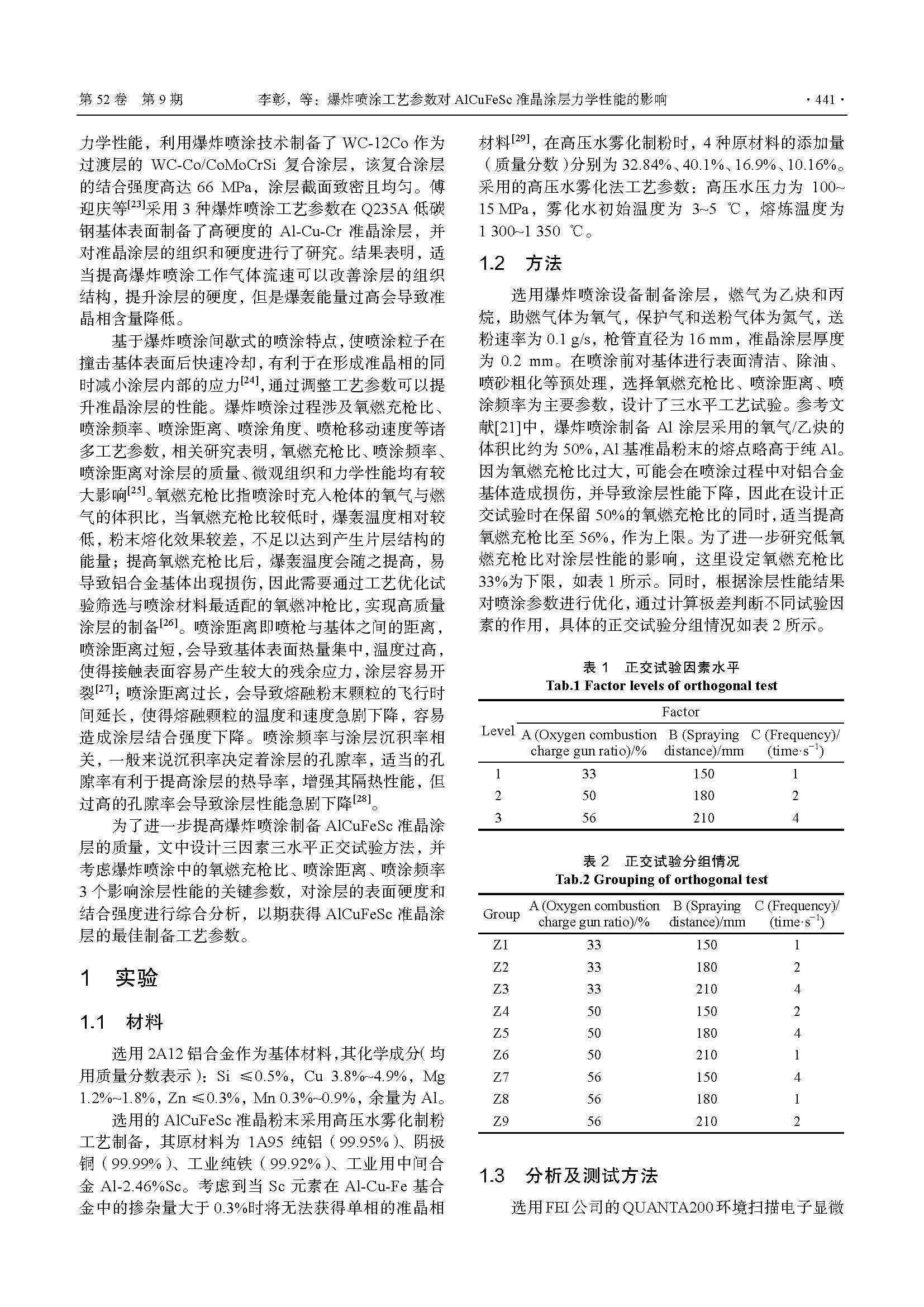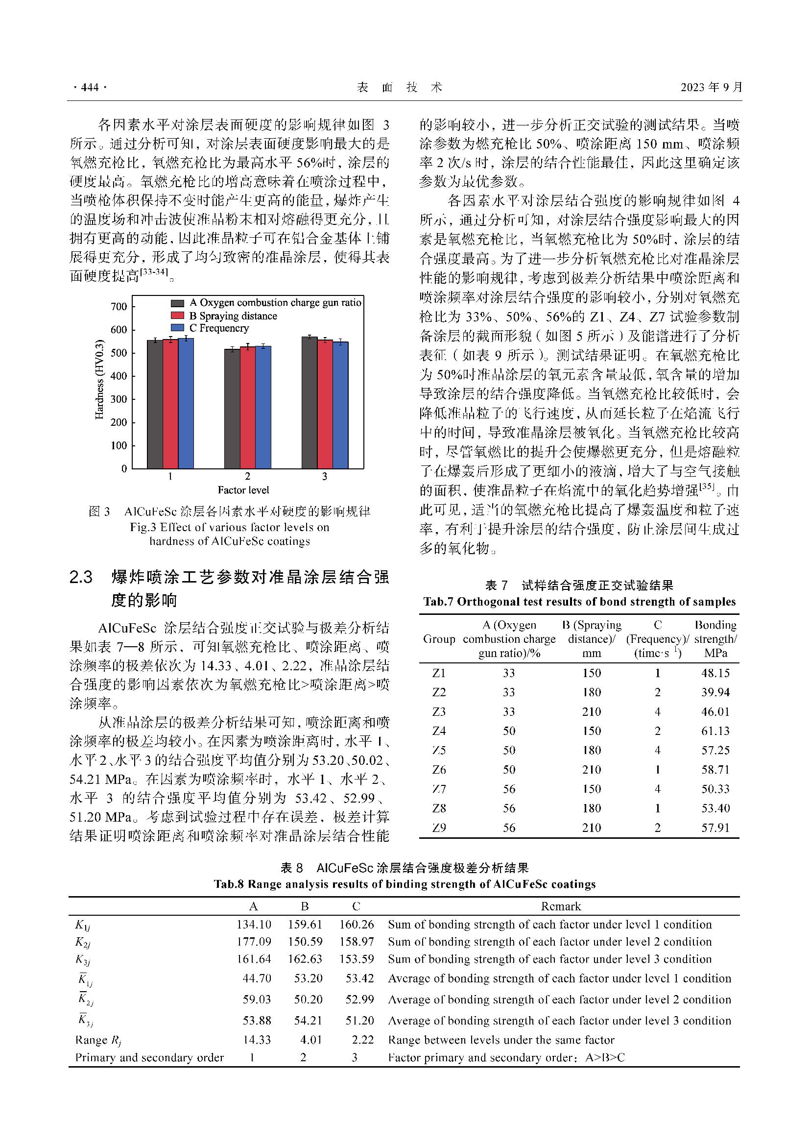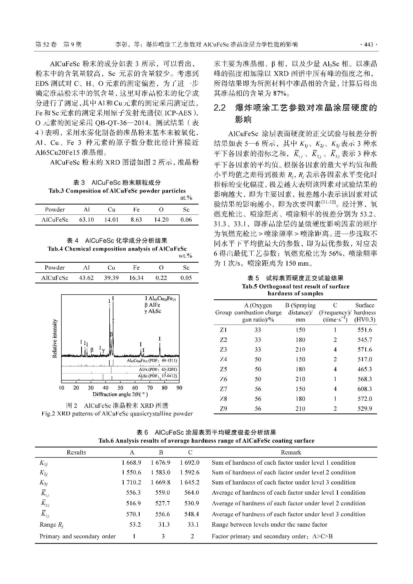 爆炸喷涂工艺参数对AlCuFeSc准晶涂层力学性能的影响