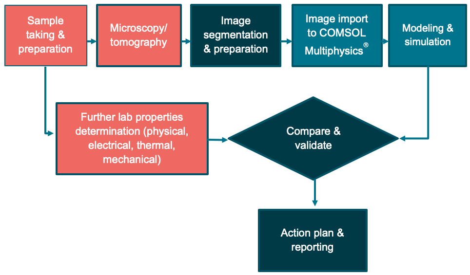 通过 LiveLink for MATLAB 应用程序,可以方便地将数以千计的图像自动导入 COMSOL 软件中进行分析。在 COMSOL 软件中,物理场是也可以互换,因此我们可以轻松地将模型转为计算材料的弹性、热导率和电导率等特性。基于仿真结果,我们能够确定材料在应用中的所有相关特性并对同一类样品进行评估。