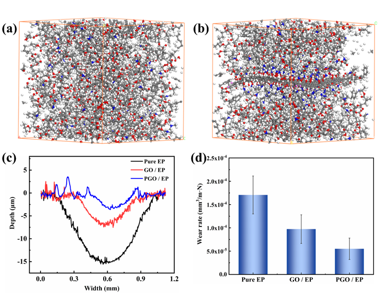图2. (a) 环氧涂层(b) PGO/EP复合涂层的力学性能计算;(c-d) 复合涂层的摩擦学性能测试。