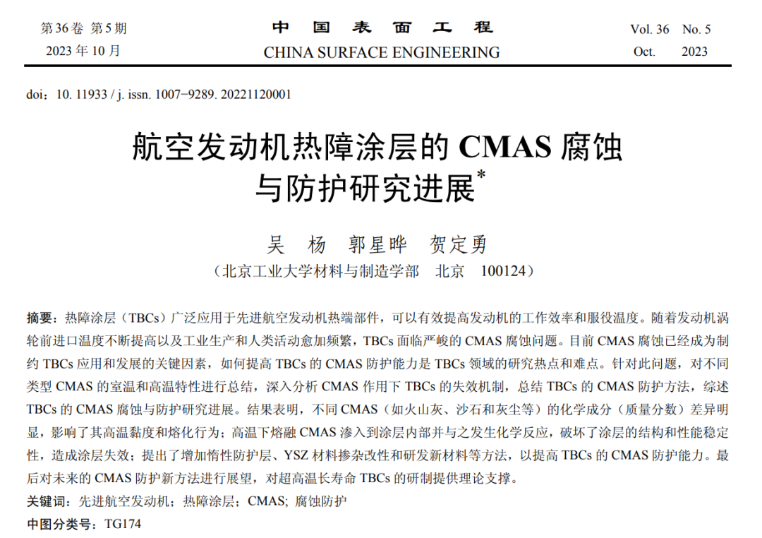 热障涂层(TBCs)广泛应用于先进航空发动机热端部件,可以有效提高发动机的工作效率和服役温度。随着发动机涡轮前进口温度不断提高以及工业生产和人类活动愈加频繁,TBCs面临严峻的CMAS腐蚀问题。目前CMAS腐蚀已经成为制约TBCs应用和发展的关键因素,如何提高TBCs的CMAS防护能力是TBCs领域的研究热点和难点。 北京工业大学贺定勇教授团队在《中国表面工程》2023年第5期发表综述论文《航空发动机热障涂层的CMAS腐蚀与防护研究进展》,对不同类型CMAS的室温和高温特性进行总结,深入分析CMAS作用下TBCs的失效机制,总结TBCs的CMAS防护方法,综述TBCs的CMAS腐蚀与防护研究进展,对未来的CMAS防护新方法进行展望。 引用格式 吴杨, 郭星晔, 贺定勇. 航空发动机热障涂层的CMAS腐蚀与防护研究进展[J]. 中国表面工程, 2023, 36(5): 1-13. WU Yang, GUO Xingye, HE Dingyong. Research Progress of CMAS Corrosion and Protection Method for Thermal Barrier Coatings in Aero-engines[J]. China Surface Engineering, 2023, 36(5): 1-13. 精彩看点 1. 论文创新点