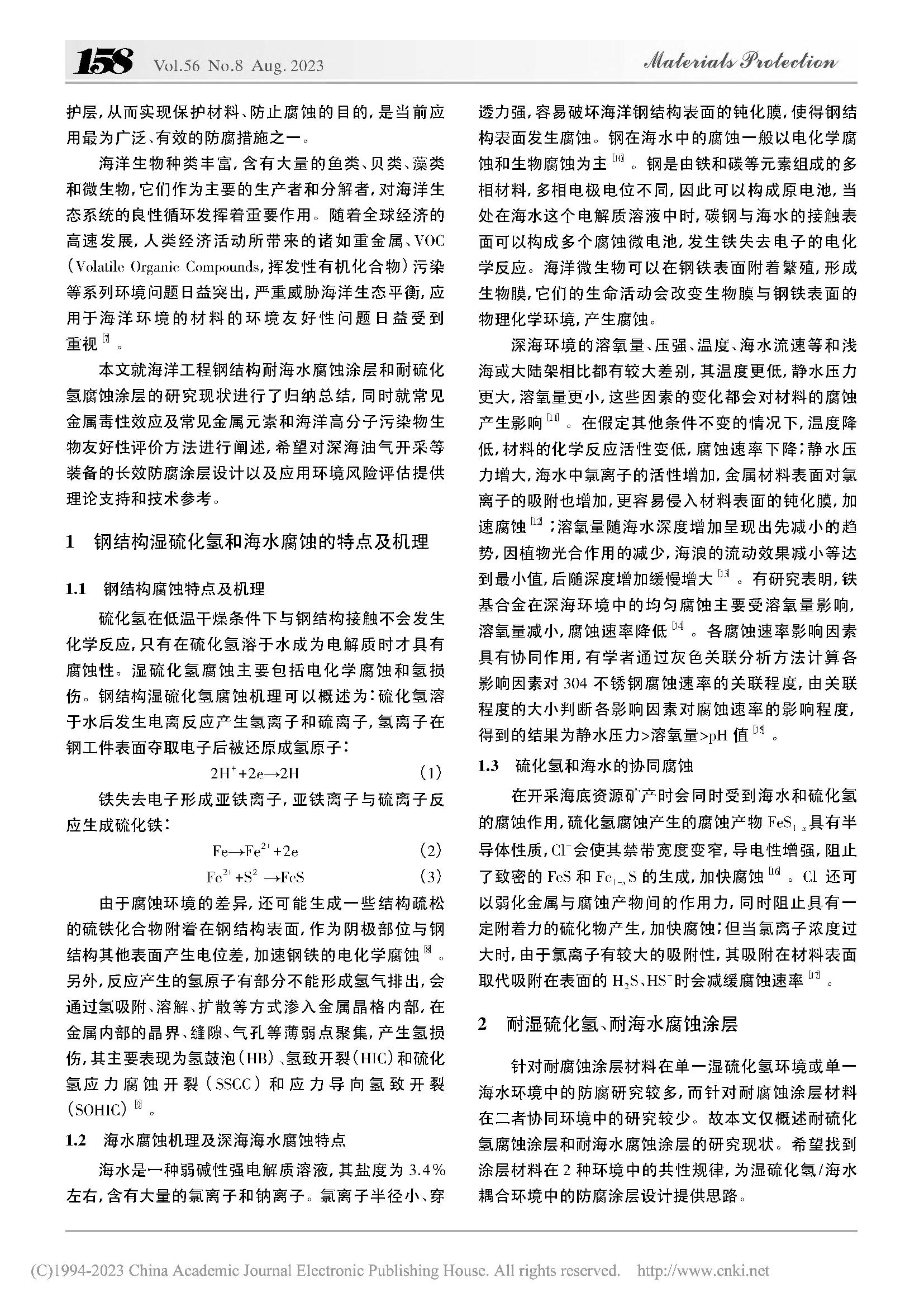 海洋环境中钢结构耐湿硫化氢/海水腐蚀防腐涂层研究现状