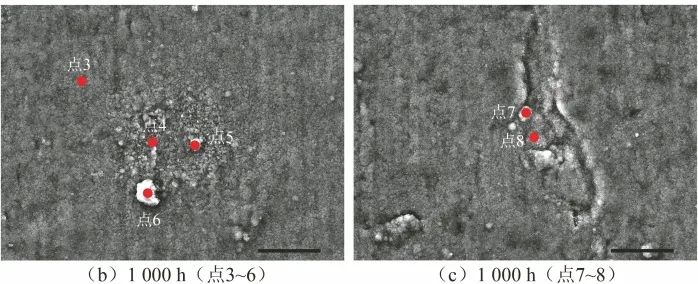 图5 在650 ℃/20 MPa的sCO2环境中腐蚀500 h与1000 h的800H合金表面EDS分析位置