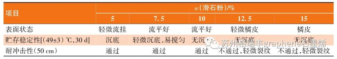 由表7可知,随着滑石粉质量分数增加,涂层表面状态从逐渐平滑到出现橘皮,耐冲击性逐渐降低,但贮存稳定性得到提高。由于滑石粉具有特殊的层状结构和较大的径厚比,随含量增加,粒子在基体中分散性差而产生团聚现象,使涂层的耐冲击性降低[20]。贮存稳定性的提高是因为当质量分数增加时,滑石粉的体积占比和颗粒浓度增加,颗粒之间的相互作用力增强,从而降低了沉降的倾向性[21]。根据表7结果综合分析,可以确定滑石粉质量分数为7.5%~10%。后续实验中滑石粉质量分数为10%。