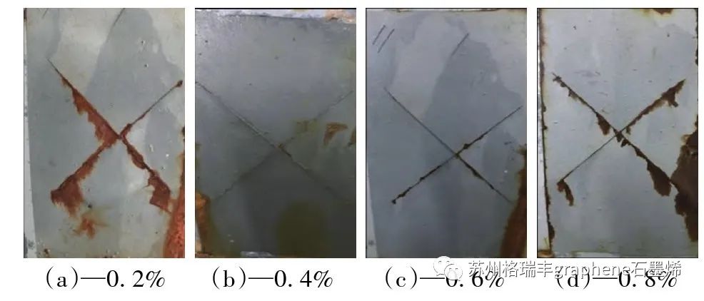 以上述得到的最优成膜物体系为基础,调整石墨烯质量分数为0、0.2%、0.4%、0.6%、0.8%,测试所得涂层耐盐雾性,结果如图1所示。