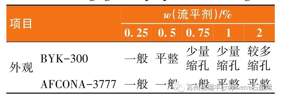 从表9可以看出,加入BYK-300(有机硅类型)对涂层的流平性和外观有很大的改善,但是当质量分数超过0.5%,涂层容易出现缩孔。使用AFCONA-3777(氟碳改性聚酯)对涂层流平性的改善稍弱于BYK-300,质量分数达到1%时流平效果良好,进一步增加对涂层外观无明显影响。