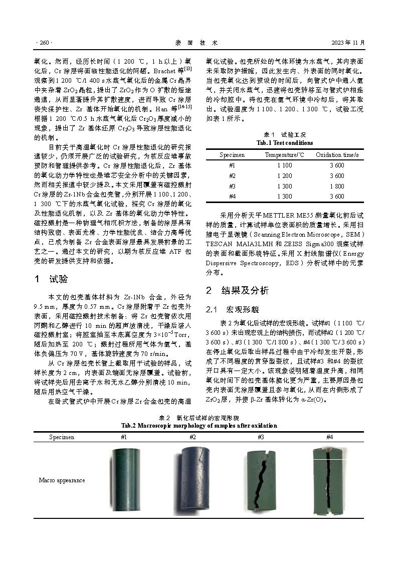 磁控溅射铬涂层锆合金包壳高温水蒸气氧化行为