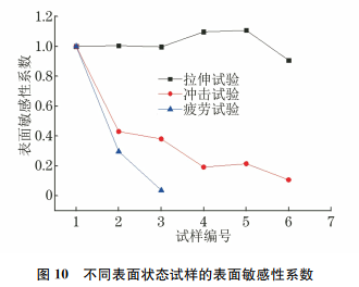 (1)Ti80合金表面打磨态和深缺口试样的抗拉强度呈增加趋势,预制裂纹试样的抗拉强度下降较为明显,断后伸长率随着表面质量的下降及缺口深度的增加而减小。 (2)Ti80合金不同表面状态试样的冲击吸收能量随着表面质量的下降及缺口深度的增加显著减小,表面打磨划痕及微小缺口均会使材料的疲劳寿命显著缩短。 (3)不同表面状态试样静态拉伸试验的表面敏感性系数浮动较小,不同表面状态试样的力学性能对于动态加载过程更敏感。
