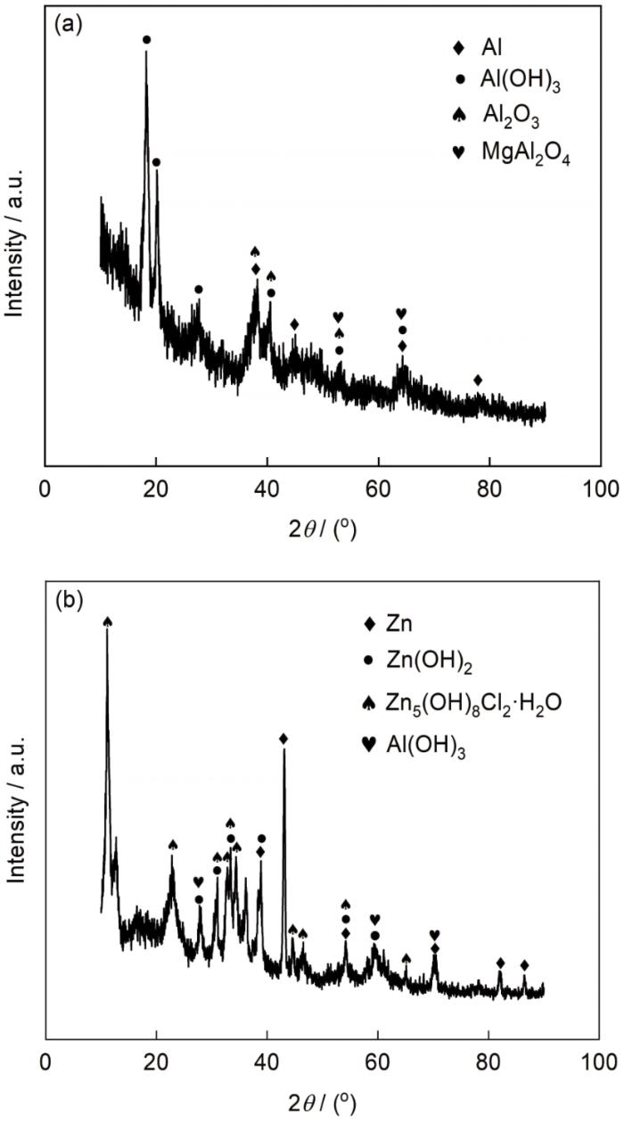 对5083铝合金涂层和Zn15Al涂层进行腐蚀产物成分分析,两种涂层经盐雾腐蚀100 d后的XRD如图6所示。5083铝合金腐蚀产物层中主要由Al单质、尖晶石结构的MgAl2O4和腐蚀产物Al(OH)3、Al2O3组成。MgAl2O4是铝合金在熔炼过程中由Al2O3和MgO高温烧结而成的,其结构致密,化学稳定性好,反应式如 式 (3) 所示[30,31]。大气环境下Al发生腐蚀的电化学反应如 式 (4) 和 (5) 所示,总反应如 式 (6) 所示[32],Al2O3为Al(OH)3脱水产物,两者均不易溶解,性能较稳定。Zn15Al涂层的腐蚀产物主要由Zn(OH)2和Zn5(OH)8Cl2·H2O组成,亦有少量的Al(OH)3生成。在腐蚀过程Zn发生溶解,与OH-结合生成Zn(OH)2,对应阳极、阴极的电化学反应如 式 (7) 和 (5) 所示,总反应如 式 (8) 所示,当Cl-侵入涂层时将会生成锌的碱式氯化盐Zn5(OH)8Cl2·H2O,反应如 式 (9) 所示[33]。这种以部分离子取代原有腐蚀产物结构中的空位从而形成新的腐蚀产物的过程,使得这些碱式复盐疏松、易溶[34,35]。
