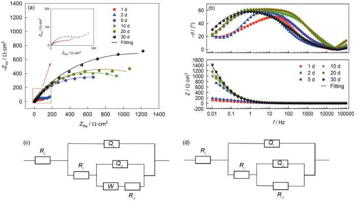 5083Al合金涂层和Zn15Al涂层经盐雾腐蚀实验后,将其浸没于3.5% NaCl溶液中进行EIS测试,结果如图7和8所示。根据阻抗谱的特征,将5083铝合金涂层的腐蚀分两个阶段。腐蚀初期 (1~2 d),Nyquist图在低频段表现为45°斜线,说明存在扩散行为,这是由于涂层表面存在孔隙,腐蚀介质向涂层内部扩散所致。随腐蚀时间延长 (5~30 d),Nyquist图中低频扩散现象消失,这是因为腐蚀产物逐渐堵塞了孔隙,不再有腐蚀介质的扩散。并且,从图7b的Bode图中可以看出,相位角峰不对称且明显宽化,表现出两个时间常数的特征。因此,采用如下图7c和d的等效电路图分别拟合上述两个阶段的电化学阻抗谱,其中Rs表示溶液电阻,Rc表示涂层电阻,Rct表示电荷转移电阻,Rp为极化电阻,为Rs、Rc、Rct之和,代表了体系的总阻抗大小,Qc和Qct为相位角元件,拟合结果如表4所示。