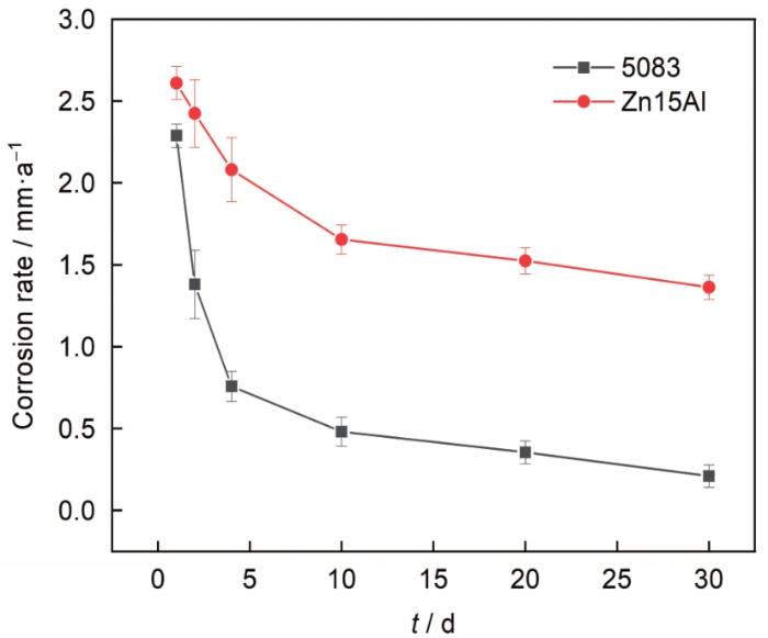 两种涂层在中性盐雾环境下的腐蚀产物厚度如表3所示。Zn15Al涂层的腐蚀产物层厚度大于5083Al合金涂层的腐蚀产物层厚度,说明Zn15Al涂层的腐蚀速率快于5083Al合金涂层。并且,Zn15Al涂层中Cl的渗入进一步证明了涂层的致密性欠佳,Zn15Al腐蚀产物层表现出厚度大但不致密的特征,因此该腐蚀产物层对涂层基体的保护作用较弱,表现出较高的腐蚀速率。