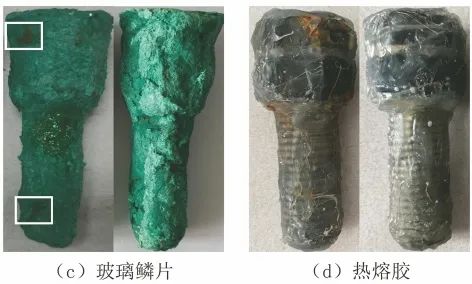 经72小时长时间的盐雾腐蚀后,玻璃鳞片涂层与螺栓的结合性有所下降,见图8(c)中的方框标记,而热熔胶涂层与螺栓结合性仍保持良好,该防腐蚀处理方法的防腐性能能长时间保持良好。