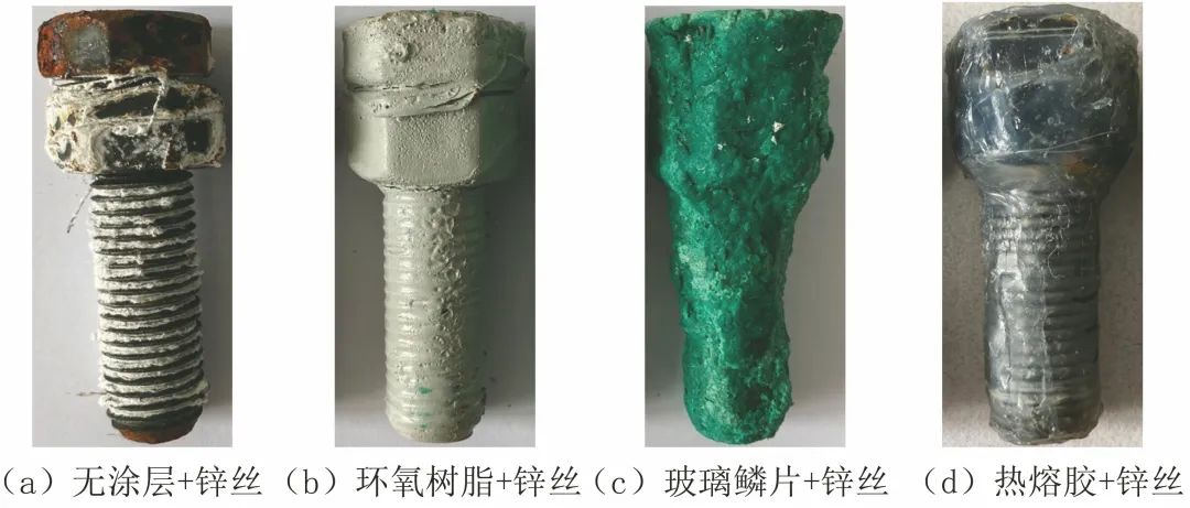 牺牲阳极为直径0.3 mm的锌丝,涂层分别为固态热熔胶,环氧树脂底漆与面漆,玻璃鳞片底漆与面漆。先将锌丝缠绕在螺栓表面,再涂覆不同防腐蚀涂层。