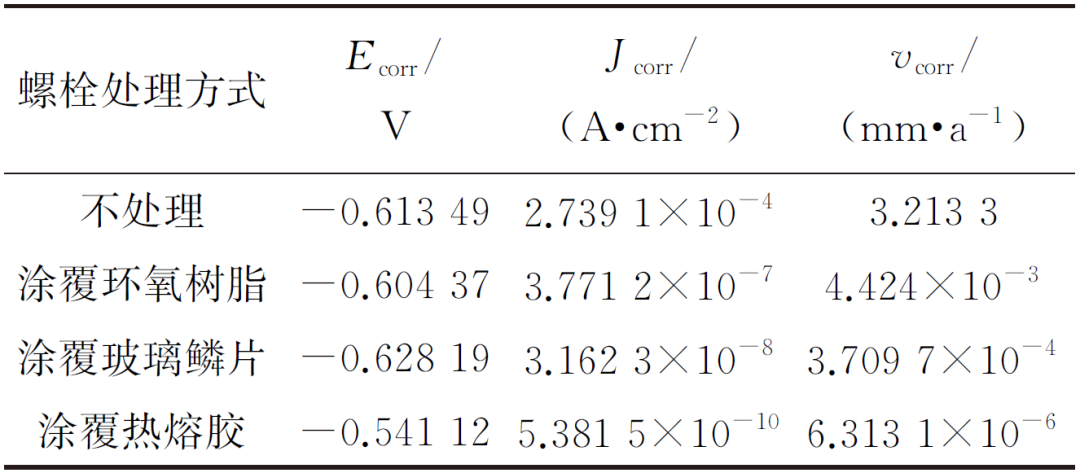 (1) 电化学测试结果表明,在三种螺栓防腐蚀涂层中,热熔胶涂层的防腐蚀性能优于玻璃鳞片涂层,而玻璃鳞片涂层优于环氧树脂涂层。