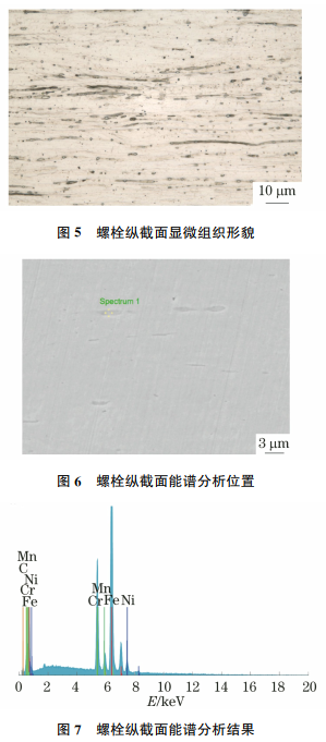 采用光学显微镜对螺栓纵截面进行金相检验,结果如图5所示,由图5可知,螺栓显微组织为奥氏体+铁素体+颗粒状碳化物。对螺栓纵截面进行扫描电镜和能谱分析,结果如图6,7所示,由图6,7可知,铁素体呈条状沿轴向分布。