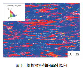 奥氏体不锈钢的塑性好,小规格的奥氏体不锈钢螺栓常采用尺寸相近的棒材或丝材原材料冷加工成型为小规格奥氏体不锈钢螺栓。奥氏体不锈钢棒材或丝材的原材料一般采用热轧的方式生产,热轧过程中发生动态再结晶,即原始晶粒因为轧制变形而沿轴向拉长,变形晶粒同时发生再结晶而形成新的等轴晶并长大。当再结晶不完全时就会形成形变织构组织。