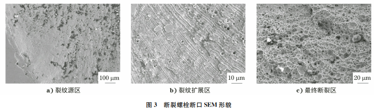 采用场发射扫描电镜(SEM)对断口进行微观形貌分析,结果如图3所示。由图3可知:断裂起始于螺栓边缘,以疲劳断裂的方式扩展,随着螺栓受力面积的逐渐减少,最终发生过载断裂,断口呈韧窝状塑性断裂特征。