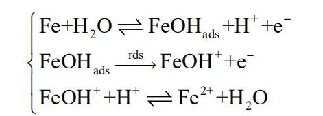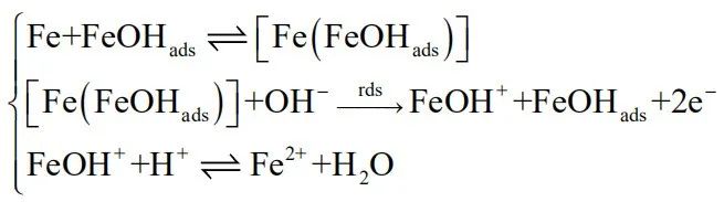 而在连续机制中,Fe的溶解被认为是一种连续的“序列”,中间产物FeOHads随着反应的进行会发生不可逆的变化,反应式如下: